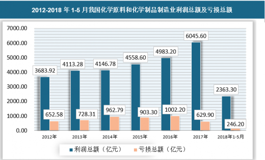 截至2018年5月,我国化学原料和化学制品制造业利润总额为2363.3亿元,亏损总额246.2亿元,亏损深度为10.4%。