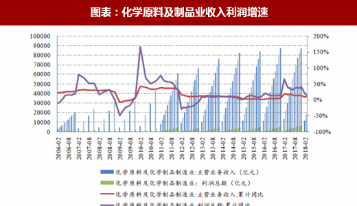 2016 年下半年以来,受益于国际油价的反弹和化工品价格的上涨,化工行业收入、利润增速均出现回升。2018 年 1-4 月,化学原料及化学制品制造业共实现营业收入 24793.3 亿元,同比增长 11.80%,实现利润总额 1837.8 亿元,同比增长 23%,行业景气大幅提升。受益于产品价格上涨,化工行业总体盈利能力持续改善,推动了利润的大幅增长。
