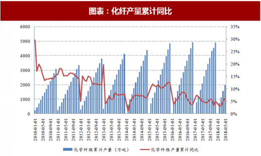 需求层面,染料下游主要应用于纺织服装领域。作为全球最大的纺织品生产国,我国对染料的需求一直保持较高水平。2017 年以来,随着全球经济好转与我国经济的复苏,染料下游纺织服装逐步恢复增长。2018 年 1-5 月,我国纺织服装业营业收入累计增长 4.7%,增速保持稳定。从化纤产量来看,2017 年以来我国化纤产量增长 5%,增速较 2016 年有所提升。今年前 5 月,我国化纤产量 1984 万吨,同比增长 6.3%,保持了较快增长。随着下游行业的复苏,染料行业需求有望保持稳定增长态势。