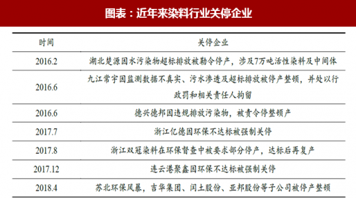 2018 年以来,苏北化工园区被报到存在污染物偷排现象,江苏地区环保整治力度大幅提升,导致当地多家染料企业被迫停产。此外总书记关于长江经济带生态保护的讲话之后,长江沿岸监管升级,湖北等地化工企业受较大影响,导致染料供应大幅收缩,推动了染料价格的上涨。如分散黑从去年底的 2.55 万元/吨上涨至 5 万元/吨,价格接近历史高位。