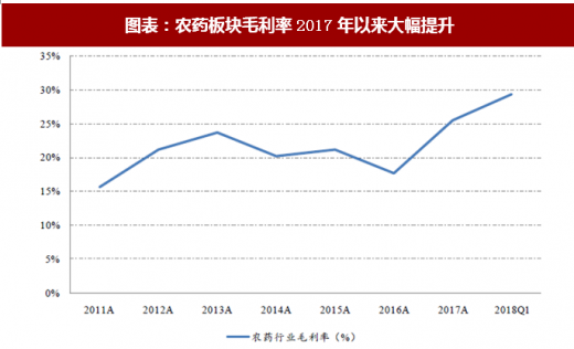 随着农药行业供给端的收紧,近年来我国农药产量持续下滑。2017 年我国农药原药产量 294.1 万吨,同比下降 8.70%。2018 年前 4 月,我国农药原药产量 88.8 万吨,同比下降 11.1%。随着农药供给端的持续收紧的,我国农药行业供需格局开始好转,部分农药品种价格开始上涨。如草甘膦从低位的 17259 元/吨上涨至 24407 元/吨,涨幅超过 40%,、百草枯、菊酯等农药价格均出现一定幅度的上涨,行业有所复苏。受益于此,农药行业整体盈利能力自 2017 年以来开始大幅提升。今年一季度,农药行业上市公司整体的毛利率为 29.3%,创历史新高。