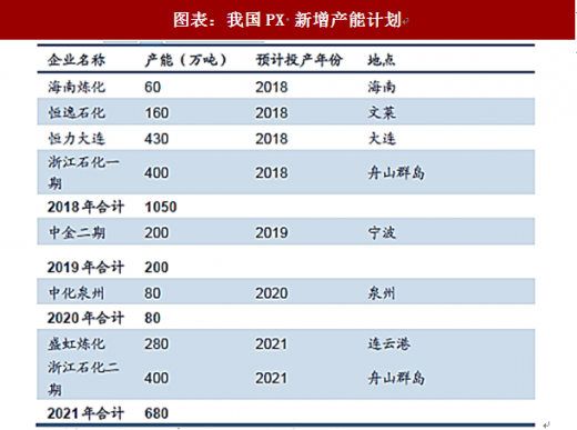 根据ihs预计,在gdp增速不低于6%时,聚酯的需求将维持5%左右的自然增速,即每年200万吨的自然需求增长(纺服的刚需)。同时,2017年7月,为保护中国的环境和人民群众的健康,我国调整进口固体废物清单,并拟于2017年底前,禁止进口4类24种固体废物,包括生活来源废、钒渣、未分类的废纸及废纺织品等等。其中,废pet饮料瓶以及pet的废碎料也在禁止进口之列,以2016年我国进口废弃pet塑料碎及饮料瓶共250万吨来计,禁废令将带来我国约250万吨的pet需求。因此,我们保守的估计2018年聚酯需求量将增加450万吨(200万吨自然增长 250万吨禁废令增长),2019-2021年每年新增自然需求200万吨。根据1吨聚酯需要0.86吨pta,1吨pta需要0.66吨px的物料平衡关系,2018年px新增需求将达到255万吨,2019-2021年px每年新增需求113万吨。