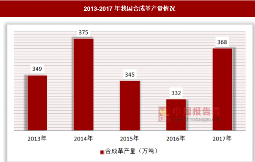 2015-2015年,受到全球经济放缓的影响,我国合成革数量产量相对于2014年的375万吨有所下降,但从2017年开始,全球经济回暖,合成革行业重新步入上升通道,2017年产量约为368万吨左右。
