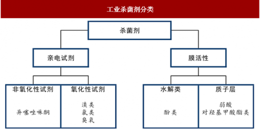 工业杀菌剂按照作用机理可分为亲电试剂和膜活性试剂,亲电试剂按照杀菌机理又可分为氧化杀菌剂和非氧化性杀菌剂两大类。氧化性杀菌剂通常为强氧化剂,主要通过与细菌体内代谢酶发生氧化作用而达到杀菌目的。常用氧化性杀菌剂有氯气、二氧化氯、溴、臭氧、过氧化氢等。非氧化性杀菌剂是以致毒剂的方式作用于微生物的特殊部位,从而破坏微生物的细胞或者生命体而达到杀菌效果,常见非氧化性杀菌剂有氯酚类、异噻唑啉酮、季铵盐类等。