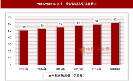全球的工业杀菌剂产量和市场规模都在不断增长,但增长较为平稳,到2017年产量约为145万吨,市场规模达到了59亿美元左右。