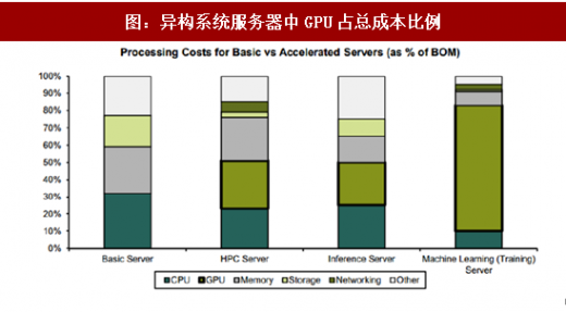 gpu cpu异构架构成为面向a.i服务器的主流架构。随着计算复杂度的逐步提升,服务器采用的处理系统并未单纯的只有gpu或gpu,而是由cpu和gpu组合而成的异构系统,两种处理器各取所长,密集的处理任务交给gpu,复杂的逻辑运算交给cpu,两种处理器协同工作,提升系统的运算速率。在a.i处理需求带动下,异构系统越来越普遍,gpu的市场需求也会进一步的扩大。bernsteinresearch统计数据表明,随着gpu cpu异构系统越来越多地应用到a.i领域,gpu价格在数据中心成本占比越来越高。
