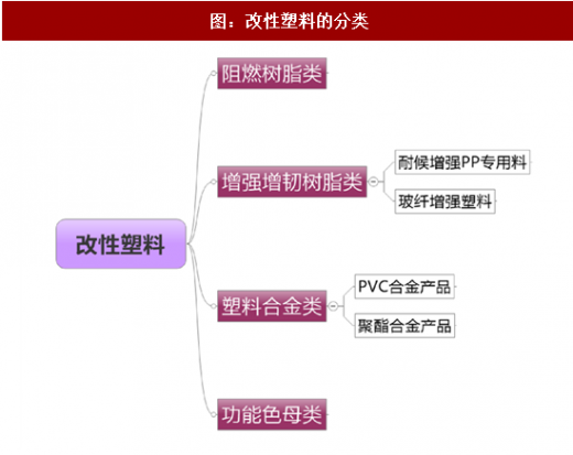 根据改性后的功能,改性塑料包括阻燃树脂类、增强增韧树脂类、塑料合金类、功能色母类等种类,各个种类按着不同的材质又可以细分下去,并且由于各自的性能差异,应用领域也各有不同。