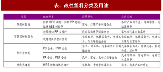 因此改性塑料产业链的上游是 pe、pp、pvc 等合成树脂,通过物理或者化学方法进行改性得到改性塑料,再经过挤出、、压延等工艺得到改性塑料制品,由于其性能优异,改性塑料制品广泛应用于家电、汽车、建筑等行业。