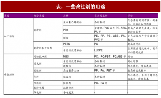 加工助剂是用于改善塑料的加工流变性以及成型性能的助剂,主要包括:润滑剂——改善基材的流动性;热稳定剂、抗氧化剂——改善基材的热稳定性;分散剂——改善基材的分散性;相容剂、偶联剂——改善基材的兼容性;架桥剂、增粘剂——改善基材的熔融强度。功能助剂主要用于改善基材的物理、化学特性,包括:填充剂、晶核剂 ——改善基材的刚性、强度;抗冲改性剂——改善基材的冲击性;阻燃剂— —改善基材的阻燃性,改性后的材料在受到火源攻击时,能有效的阻止、延缓或终止火焰的传播;安定剂——改善基材的耐候性;导电涂料填料、抗静电剂——改善基材的导电性,抗静电剂可减轻塑料在加工和使用过程中的静电积累,降低材料表面电阻率;可塑剂——改善基材的软硬度;发泡剂—— 改变基材的密度;色料——改变基材的透明性、颜色。