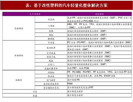 改性塑料在汽车部位上的应用涵盖内外饰件、功能和结构件,随着纤维增强技术的发展,特别是碳纤维复合材料的发展,甚至车身、底盘等都可以完全用改性塑料和复合材料制造。