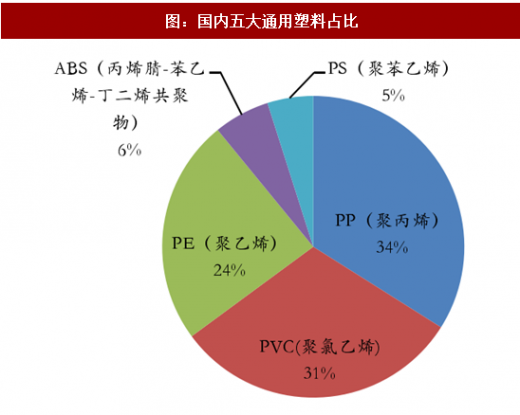 聚氯乙烯具有耐磨性、抗腐蚀性、难燃性、电绝缘性等优良性能,广泛应用于建筑、电力、公用事业等领域,已成为广泛应用的五大通用塑料(聚丙烯、聚氯乙烯、聚乙烯、丙烯腈-苯乙烯-丁二烯共聚物、聚苯乙烯)之一。2016 年国内聚氯乙烯产量为 1661 万吨,占比约 1/3,产量略低于聚丙烯。