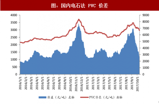 pvc 价差扩大。2017.1—10 月 pvc 价差最高达到 2700 元/吨,主要原因:pvc 价格处于高位,电石价格相对较低,企业盈利能力改善,因电石价格持续上涨,价差缩小。 我们判断未来国内 pvc 产能整体趋稳,下游需求稳中有升,供需处于紧平衡,为价格上涨或保持高位奠定基础。