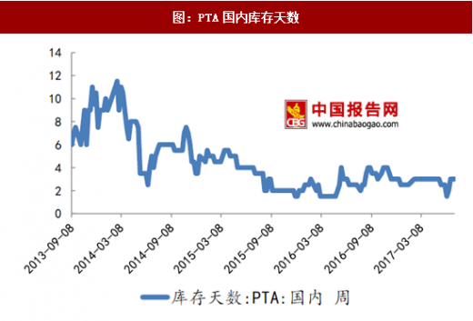 从国内pta表观消费量来看,近几年国内pta表观消费量一直稳定在3,100万吨左右,可见,目前国内pta行业供给格局已经处于较为健康的状态。此外,从pta库存情况来看,随着国内pta供给格局的改善,企业平均pta库存天数一直呈下降趋势,目前稳定在低位,这对pta价格也将形成有效支撑。