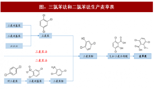 目前麦草畏的生产工艺主要有两种二氯苯法和三氯苯法。三氯苯法工艺路线短,成本低,但副产多,特别是第一步水解产率仅25%,副产酚的异构体难以分离,导致产品纯度不高;二氯苯法工艺路线长,且产生大量酸性废水,生产成本高。目前国外厂商如巴斯夫主要采用三氯苯工艺,而国内厂商扬农主要采用二氯苯工艺,长青股份则两种工艺兼而有之。