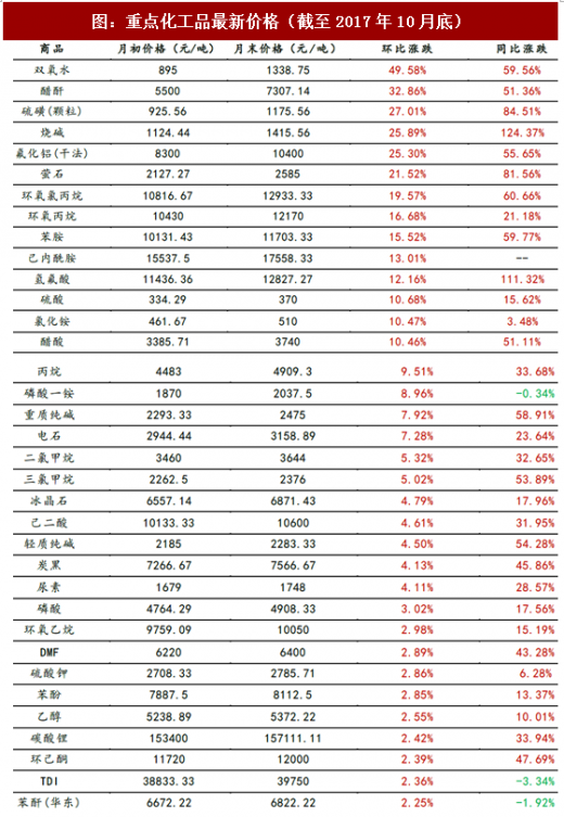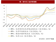 整体来看,首先参考化工品价格指数,可见,化工各子行业ppi从2016年11月起同比开始转正,今年2月后化工品价格有明显回落,但后期由于环保督查致产能趋紧,同时叠加下游需求回暖,价格有所回升,目前化工行业ppi指数维持在较高的水平,其中化学原料及化学制品制造业、化学纤维制造业、和制品业和化学工业ppi指数今年10月同比涨幅分别为10.7%,11.6%,3.4%和7.5%。