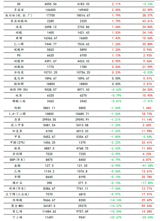 细分来看,参考生意社网站公开的73种化工大宗商品数据,可以看到,截至10月份最新数据,化工品价格普遍上涨,环比上涨数量为48,环比下降数量为23;相比去年同期,化工品价格也实现了同比大幅增长,同比上涨数量为63,同比下降数量仅为10。