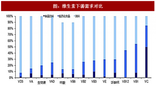 维生素种类较多,可以分为维生素a、维生素b1、维生素b2、维生素b3、维生素b5、维生素b6、维生素c、维生素d3、维生素e、维生素h、维生素k3等品种。其下游应用以饲料添加剂为主,占比在50%左右,其他使用领域是医药、化妆品、食品等行业。从维生素的全球使用量来看,使用量最大的是维生素a、维生素c和维生素e几个品种。