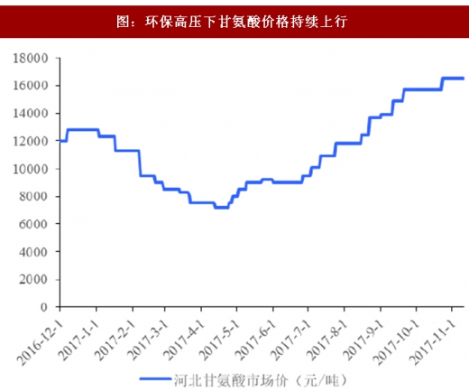 草甘膦生产工艺主要有甘氨酸法和ida法两种,国内目前的工艺路线中甘氨酸法产能占比约70%,ida法产能占比约30%。上游原材料主要包括甘氨酸、甲醇、黄磷、多聚甲醛、液氨等。甘氨酸路线“三废”排放较多,每1吨草甘膦附产废液5吨,为有机高浓度含重金属废水,处理成本高昂。我国甘氨酸产能超60%位于河北及山东地区,三季度环保督查叠加四季度大气治理,京津冀地区环保政策持续高压,甘氨酸企业开工受限下价格持续上行。