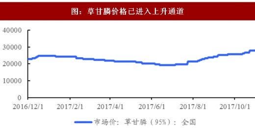 整体来看,短期内环保政策无松动迹象,成本支撑或推动草甘膦企业顺势上调价格。2017年11月95%草甘膦原药均价28500-29000元/吨,较7月初拉涨约9000元,涨幅45.5%,后市我们看好草甘膦价格继续上调。
