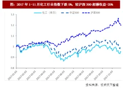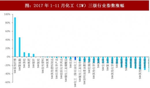 2017年1-11月,化工(sw)行业指数下跌5%,同期因市场风格偏好金融、消费等大市值蓝筹标的,沪深300指数上涨20%,化工行业累计超额收益为-25%。分季度来看,化工行业在一季度维稳,二季度下跌,三季度回升,四季度小幅回落。