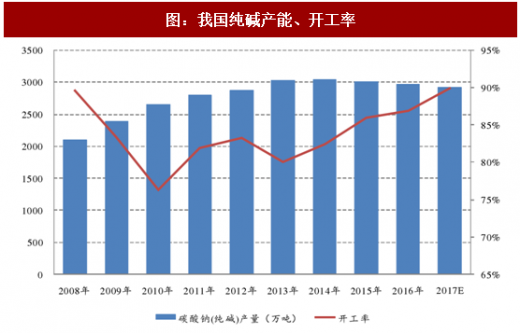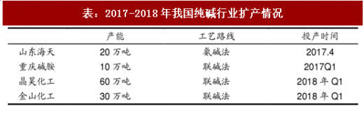 2017年我国纯碱新增产能30万吨,主要为重庆碱胺10万吨和山东海天20万吨项目。受中国经济转型、环保政策收紧等因素影响,未来行业大幅扩产可能性较小。根据卓创资讯数据,目前规划、在建项目仅晶昊盐业60万吨及金山化工30万吨,合计产能90万吨。预计2018年实际产能增速不到3%,低于需求增长。