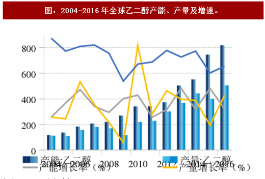 产能方面:截至2016年底,全球乙二醇生产能力已经达到3,747万吨/年,较2009年增加了近1,500万吨,年均增长约8%。