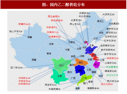 国内现有装置以石油乙烯路线为主,产能地与消费地匹配度较高;主要集中于华东、华北和华中地区,一方面近消费地,另一方面近炼厂和港口。近几年西北地区产能占比呈现较明显上升,目前已占到3%,主要是由于该地区煤炭资源较为丰富,伴随煤制乙二醇的不断发展,其产能增长速度较快。