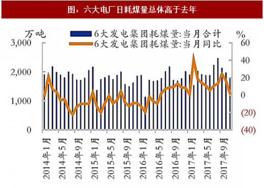 2017 年需求旺盛。六大电厂的平均日耗水平高于去年,据 wind 数据,2017 年前 11 个月,六大电厂平月消耗煤炭 1979.28 万吨,高于 2016 年 12.89%。2017 年火电发电量月增速平均维持在 5%以上的水平。单月产量也屡创新高,2017 年 1-10 月粗钢产量 7.1 亿吨,同比增长 6.1%。