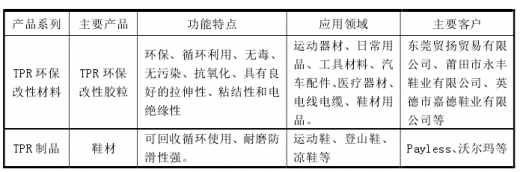 目前主要应用于高档鞋材、沥青改性等领域。tpr环保改性材料的原材料,主料有sbs、基础油、ps再生料,辅料有助剂等,含有5%-30%的再生料。tpr环保改性材料生产的相关制品,经its检测等权威第三方检测机构检验后满足客户需求,品质优良,性能稳定,并可再生利用,具有低碳、节能、环保特点。其具体产品系列、特性和应用领域见下表所示:
