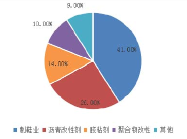 热塑性橡胶主要以sbs为原材料。随着制鞋、公路建设等行业的发展,近年来我国sbs的消费量增长迅速。2004年我国sbs的表观消费量为35.54万吨,2004-2009年消费量的年均增长率约为9.66%。与此同时,产品的对外依存度不断降低。2006年对外依存度为38.36%,2009年下降到22.65%。我国sbs产品主要用于制鞋、沥青改性、聚合物改性以及胶粘剂等方面,目前我国sbs的消费结构为:制鞋约占41.0%,沥青改性剂约占26.0%,胶粘剂约占14.0%,聚合物改性约占10.0%,其他方面约占9.0%。我国sbs消费结构如下图所示: