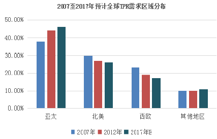 在加工温度下,这种硫化橡胶性能消失,因此可做进一步加工。当材料回到其使用温度时该种性能即又恢复4。tpr属于tpe中的苯乙烯类(tps)。按区域板块划分,亚太地区是全球tpr需求最大的区域,2012年需求量约占全球总需求量的44%,预计到2017年,该地区对tpr的需求增速会高于全球平均增速,约占全球47%。北美和西欧地区对tpr的需求相对于2007至2012年的停滞状态也会得到改善,但是由于亚太地区需求的增长,导致其占全球的需求份额会缩小。