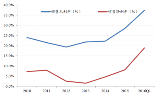 毛利和净利润率大幅提升,资源行业的业绩弹性充分体现。2016年一季度板块的毛利率从2015年的28.5%上升至37.4%,上升了近9个百分点,板块的净利润率也从8.1%上升至18.9%,增加10.8个百分点。毛利率的上涨全部转化为净利润率,资源行业涨价的弹性展现的淋漓尽致。