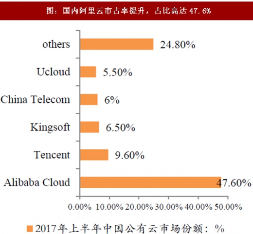 2017年顶尖云计算服务商在国际崭露头角,国内iaas市场集中度进一步提升。gartner发布的《2016年全球iaas》报告上阿里云获得3%市场份额,位居全球第三,力压googlecloudplatform,idc云基础设施季度追踪报告显示,华为和浪潮以3.1%、2.2%市场份额进入到市场前五;另一方面,国内云计算阿里一家独大,idc中国公有云iaas市场报告显示阿里云以47.6%市占率位居首位,约为排名第二的腾讯云市占率的5倍,比2016年上升7个百分点。