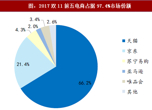 2017年双11前五电商合计占据97.4%市场份额,其中天猫和京东市场份额分别为66.2%和21.4%,相较其他电商优势明显;苏宁和亚马逊双十一交易额分别同比增长 183%和 179.7%,份额双双提升。