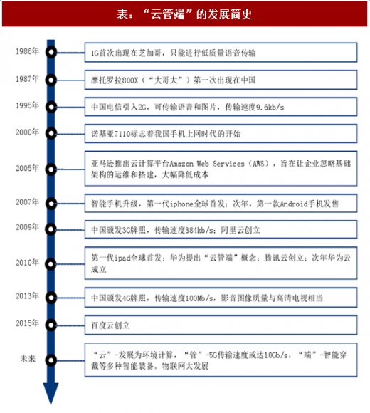 智能移动终端的出现是云计算发展的关键。从“云管端”的发展历史来看,“管”和“云” 的发展要早于“端”,并一度受到“端”的制约。2001 年日本即开始 3g 商用,2005 年亚马逊推出云服务,但由于没有普及性的智能化终端设备,较高的带宽和较强的计算存储能力都缺少实际用处,难以找到商业模式。2007 年起 iphone 的出现和流行使得智能终端向大众普及,数据量的快速增加很快让 3g 带宽不够用,2009 年瑞典开始 4g 商用,2013 年中国颁发 4g 牌照;同时,“端”和“管”的发展进一步促进了云的成熟,2009 年起阿里、腾讯、华为、百度陆续推出云服务,云服务的普及化程度越来越高。