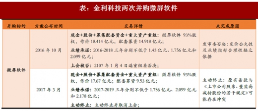 2016 年10 月,金利科技发布公告以18.414 亿收购微屏软件93%股权,同时配套募资14.918 亿元,微屏软件三年利润承诺分别不低于1.43 亿、1.756 亿和2.099 亿。2017 年1 月4日,证监会重组委因标的定价公允性及业绩指标合理性缺乏依据否定交易方案。2017 年3 月,公司修改收购方案,调低交易价格和募资金额、修改利润承诺期限等。鉴于证监会2017 年5月26 日发布的《上市公司股东、董监高减持股份的若干规定》限制了非公开发行股票和减持,交易对方对原有交易方案的相关商务条款存在疑问,公司主动终止方案。
