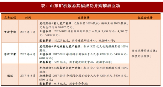 2017 年1 月,山东矿机首次发布预案,以10.027 亿元购买文脉互动、麟游互动100%股权,同时募集配套资金10.027 亿元。证监会就标的业绩数据的真实性、估值合理性等问题提出询问。2017 年6 月山东矿机修改方案,放弃收购文脉互动,支付对价、业绩承诺和配套募资亦修改,修改后方案不构成重大资产重组。2017 年8 月提交的最终方案将配套募资修改为1800 万,终获证监会审核通过。