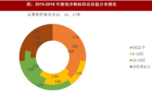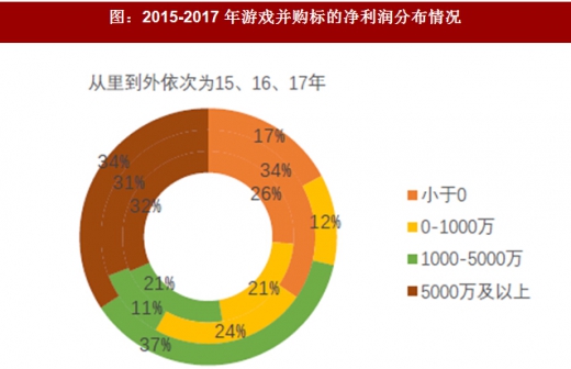 从并购标的营收规模来看,2017 年营收5000 万以下标的占比仅为32%,较2016 年的54%减少24 个百分点,1-5 亿营收规模标的占比达到37%,相比16 年增加17 个百分点。净利润方面,2017 亏损标的占比下降大幅下降,从2016 年的34%下降至17%,同时17 年净利润在1000 万-5000 万区间的标的占比大幅增加,较16 年增加16 个百分点,达37%。从整体变化趋势来看,2017 年开始上市公司对营收、净利润规模较大的游戏标的更加青睐。