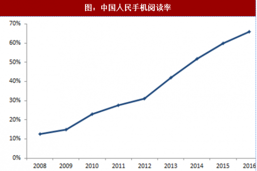 阅读率逐渐提升,阅读习惯正在养成。根据中国新闻出版研究院发布的《第十四次全国国民阅读调查》,2016年我国成年国民图书阅读率为58.8%,较2015年上升0.4%;数字化阅读方式的接触率为68.2%,较2015年上升4.2%;55.3%的成年国民进行过网络在线阅读,较2015年上升4.0%;66.1%的成年国民进行过手机阅读,较2015年上升6.1%。