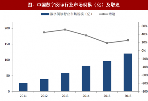 数字阅读市场规模持续扩大,2016年突破百亿规模。根据中国音响与数字出版协会数据,数字阅读行业自2011年后进入高速发展期,2015年后迈入成熟发展期,其发布的《2016年度中国数字阅读白皮书》显示,2016年我国数字阅读行业市场规模达120亿元,同比增长25.0%,得益于2016年坚持不懈地打击盗版、净化网络文学平台。