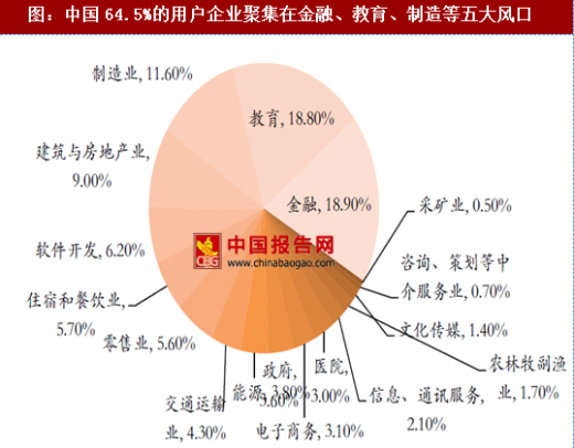 据《2017中国saas用户研究报告》显示,2017年,中国64.5%的saas用户企业聚集在金融、教育、制造、建筑地产、软件开发五大风口,其中金融行业saas应用占中国saas行业应用的18.9%,份额第一。