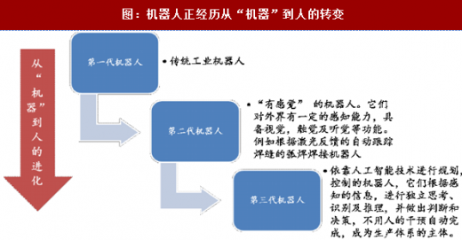 工业机器人代际演变:机器人正经历从“机器”到人的转变。我们可以将机器人分为三代,第一代为传统的工业机器人,其形态已经接近50年未发生重大改变。第二代为“有感觉”的机器人。它们对外界有一定的感知能力,具备视觉,触觉及听觉等功能。例如协作机器人、根据激光反馈的自动跟踪焊缝的弧焊焊接机器人。第三代为依靠人工智能技术进行规划,控制的机器人,它们根据感知的信息,进行独立思考、识别及推理,并做出判断和决策,不用人的干预自动完成,成为生产体系的主体,甚至可以替代机床等工作母机,例如云服务机器人。