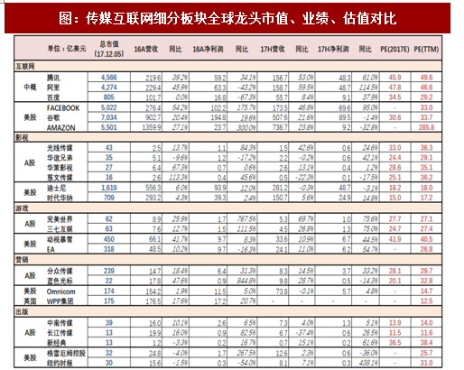 营销板块,a股平台类公司分众传媒市值超过营销龙头omnicom和wpp集团,蓝色光标市值则差距较大;而高增速的分众传媒也匹配更高估值水平。