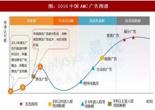 数字营销规模超过电视营销成为第一大渠道,2017年预计达到3884亿市场规模。艾瑞咨询、智研咨询数据均显示,2014年我国数字营销规模已超过电视广告规模,成为第一大渠道。经过2012-2015年的超高速高速发展,目前进入高速增长结算,艾瑞咨询预计2017年同比增长51%。该数据与ctr刊例收入变化有一定出入,可能存在的原因有:1)刊例收入通过刊例花费计算得出,实际交易过程中可能存在打折、搭售等促销方式推动市场规模增加;2)ctr互联网广告刊例收入不包含关键词搜索、垂直搜索及定向广告数据。目前搜索广告、展示广告已进入应用成熟期,广告即将进入应用成熟期,社会化按广告、程序购买正进入高速发展期,而原生广告目前正在探索阶段。