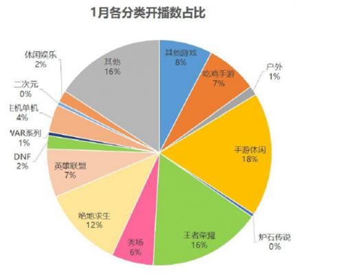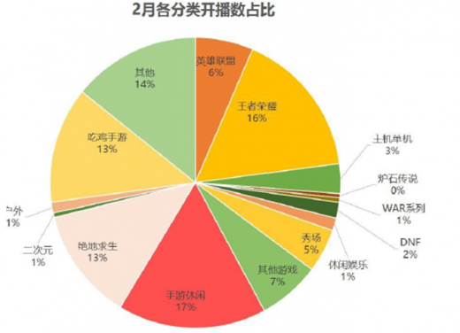 根据直播观察网的统计数据,在2018年1-2月,热门直播分类的开播数,《王者荣耀》、手游休闲、《绝地求生》开播量占比都是最高。2月份吃鸡手游开播量上涨,主要有《荒野行动》《终结者2》和《光荣使命》。随着手游电竞内容的比重迅速提升,观众看手游直播的内容越来越多,吃鸡手游和腾讯系休闲手游,正在分散用户的观看时间。绝地求生、《王者荣耀》吸引了大批头部主播跳槽到该版块,成为各平台营收的两个最重要版块。