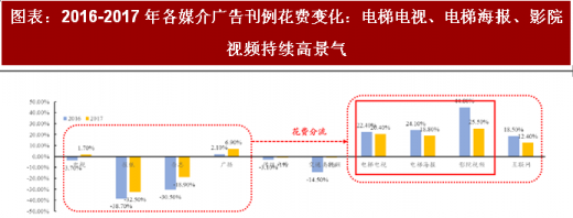 从广告细分行业来看,互联网广告、电视广告和电梯广告的投放效果排名前三,电视广告注意力下滑直接导致广告刊例费花费向互联网和电梯媒体的分流,根据尼尔森的统计,互联网眼球份额为26%,电视广告媒体眼球份额为21%,电梯广告为19%,此外,互联网流量价格趋高使得生活圈媒体广告直接受益。一个例证是楼宇媒体性价比高于视频媒体广告性价比,框架cpm较视频平台的贴片价格更低,约为20元 ,爱奇艺暂停贴片广告cpm为40元,线下的媒体广告位兼备投放效果和价格优势。我们认为,生活圈媒体不再是说一种补充广告形式,而是客户购买广告“组合包”里性价比最高的媒体营销方式。 从刊例花费变化也能印证电视等传统媒体向电梯楼宇和影院媒体的分流。2017年传统媒体电视、报纸、杂志和广播的刊例花费增速下滑或略有回暖,而生活圈媒体维持高景气:电梯电视、电梯海报和影院视频刊例花费同比增速为20.4%、18.8%和25.5%。