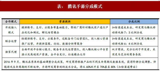 腾讯渠道除了开放的应用宝以外,相对封闭的手机qq和微信也是非常重要的渠道。根据统计数据,过去三年,手q一共代理了20多款第三方游戏,占比60%;微信一共代理了40多款游戏,占比50%。因此,无论是应用宝还是手q、微信,如果能有很好的渠道关系,尤其是手q和微信,基本等于成功了一大半。虽然手q和微信基本要求独代并高分成(根据行业地位,知名厂商可能能分到最高30%,一般厂商分成几个点到二十个点都有可能),但由于手q和微信用户量巨大,对流水的拉动作用过于明显,交给腾讯独代低分成收益可能还是好于自己发行的低流水状态,因此对于大多厂商而言,被腾讯选中就是一种成功的象征。