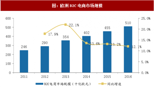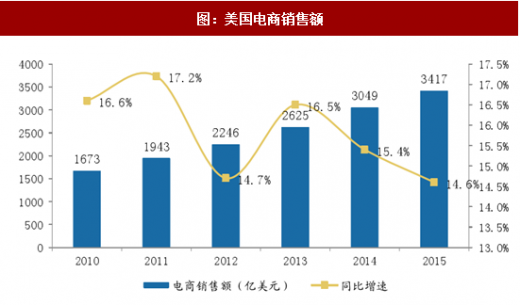 中国跨境出口电商持续高速增长背后是海外电商的快速发展。更多的境外消费者采用电商来进行消费,海外电商目前处于红利期,线上业务的增长速度很快。与中国不同的是,欧美国家线下零售业比较发达,所以在中国电商爆发的时候它们的线下零售所受冲击较小,因此电商的发展并不像中国这么快。但是随着技术的不断提升,目前海外电商在交易的便捷性,功能的丰富性等方面也对线下零售展示出自身的优势。以中国货品的主要出口地美国、欧洲为例,美国在2015年电商销售额超过3400亿美元,2010-2015年电商销售规模年增速在14%以上。而欧洲作为一个整体,其日2c电商市场规模在2016年达到5100亿欧元,同比增长12.1%。