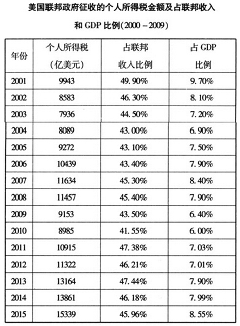 在美国,近十五年来,个人所得税收入占整个联邦税收收入的45%左右,是对财政收入贡献最大的税种(见下表)。以各个国家平均工资来计算,俄罗斯人缴纳个税的比例是13%,爱尔兰和法国个税的比例接近30%,英国则接近40%.2010年,最富有的5%美国人将负担37.1%左右的税负。10%的美国家庭(收入14万美元以上)承担了美国48.3%的税务负担。底层的60%的低收入美国家庭(收入在四万五以下)仅承担17.5%的税务负担。最底层的40%的美国家庭(收入在三万以下)仅承担7%的税务负担。