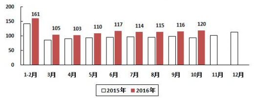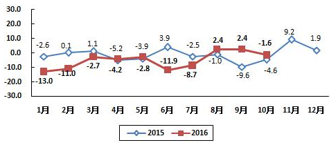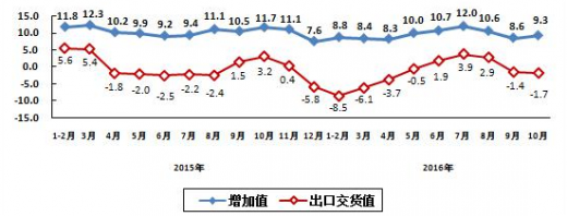 生产总体平稳,增速有所加快。2016年1-10月,规模以上制造业增加值同比增长9.7%,同比回落1.1个百分点;快于全部规模以上工业增速3.7个百分点,占规模以上工业增加值比重提高到7.4%。其中10月份增速为9.3%,比9月份加快0.7个百分点。出口交货值同比下降1.2%(2015年同期为增长0.4%),其中10月份下降1.7%(2015年同期为增长3.2%),降幅比9月份扩大0.3个百分点。